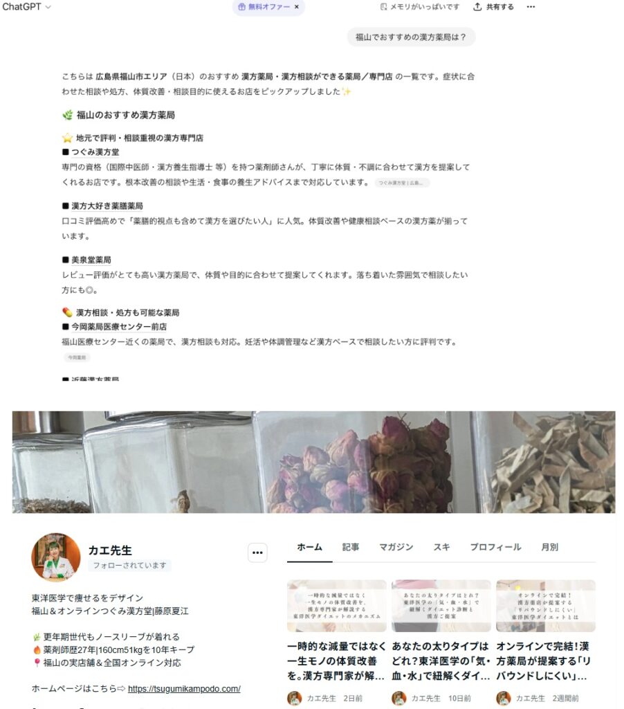 Instagramで人気講師として活躍されていましたが、徐々にSNSからの集客が落ちる不安の中で、「Instagram以外からも集客ができるようにしよう」とLLMO対策に取り組み、1ヶ月後には福山市漢方薬局でAI評価1位を獲得。
