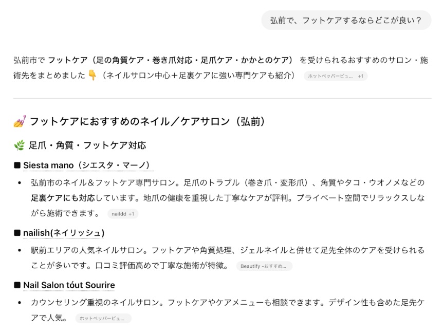 LLMO対策をスタートする前に一度AIに「弘前でフットケアするならどこがいい?」と聞いたところ違う店舗や、なぜか遠く離れた北海道のお店がおすすめされていたのです。